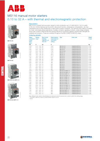 of 45 mm. Further features are the build-in disconnect function, temperature compensation, trip-free mechanism and a rotary handle with a clear switch position indication. The manual motor starter is suitable for three- and single phase applications. Auxiliary contacts, signaling contacts, undervoltage releases, shunt trips, power in-feed blocks and locking devices for protection against unauthorized changes are available as accessory. These are suitable throughout the MS116/MS132/MS165-range.