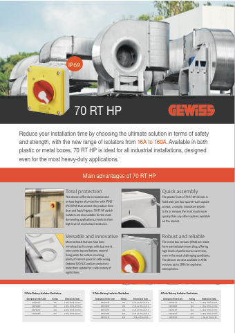 Reduce your installation time by choosing the ultimate solution in terms of safety and strength, with the new range of isolators from 16A to 160A. Available in both plastic or metal boxes, 70 RT HP is ideal for all industrial installations, designed even for the most heavy-duty applications.